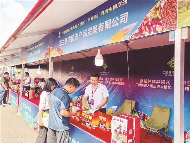 日前,“广西供销大集走进大湾区”河池专场活动在广东省东莞、惠州两市举行,东兰县5家企业带着东兰墨米、板栗、墨米酒、纳兰上游山泉水等10余种特色农产品亮相展销会。展销会上,东兰特色农产品广受大湾区采购商和市民青睐(如右图),现场销售金额达5万元,达成销售意向近300万元。