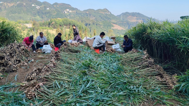 那社村海拔较高、土壤肥沃疏松,气候条件适宜,为生姜生长提供了良好环境。来自田林县的种植户盘明强和哥哥在这里一起承包了30亩土地发展生姜种植。“今年生姜收购价每斤在1元至1.3元之间,预计亩产可达5000到6000斤。”望着郁郁葱葱的姜田,盘明强掩不住的喜悦,“采收期每天要雇当地7、8名村民帮忙采姜,一天工资150元,都是当天结算。”按目前进度,采收工作还将持续半个月,有效带动了周边村民就近务工。