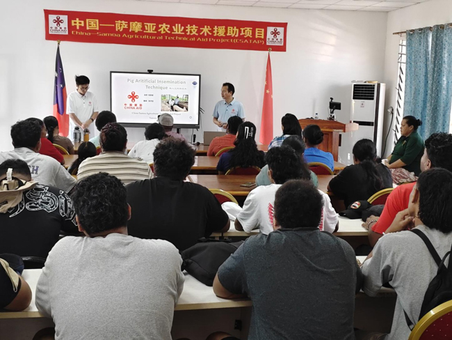 图为2025年10月16日,石忠诚向南太平洋大学师生作猪人工授精技术培训。