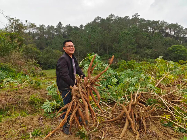 ▲张远辉和此次收获的木薯合影