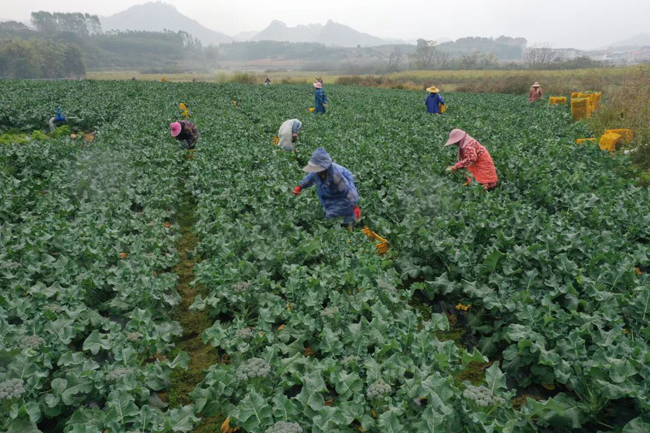 社员们手法娴熟采摘“西兰苔”。