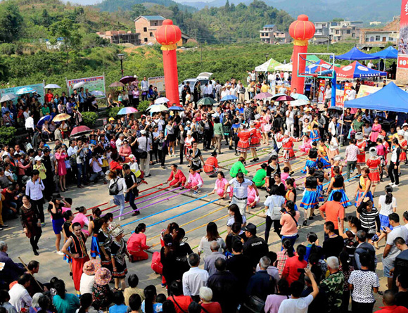 在广西柳州市融安县大坡乡岗伟村泗香屯,农民文艺队员和游客在跳竹竿舞