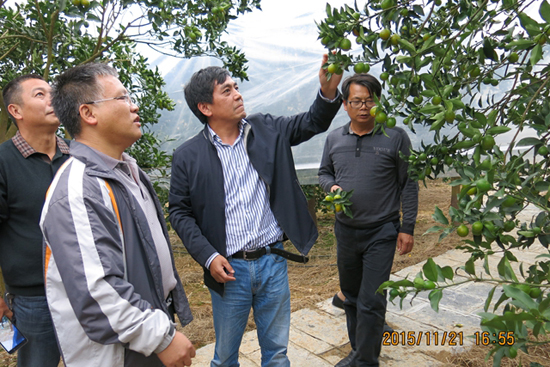 赣州市果业局副局长陈标强(右二)在查看金桔挂果情况