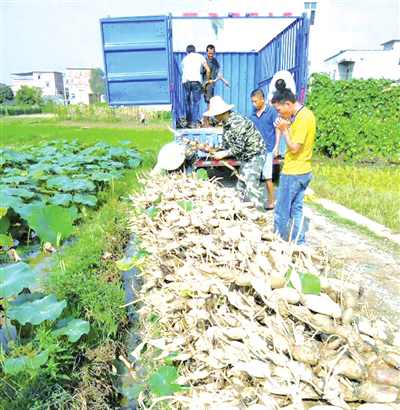8月14日,合山市荷泉莲藕种植专业合作社组织人员到宾阳县黎塘镇采购优质藕种,大力发展莲藕种植业,带动贫困户脱贫致富。截至目前,该合作社已购回19吨藕种,将带动63户贫困户发展莲藕种植。图为合作社会员在装运藕种。(覃如成 摄)