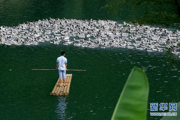 8月7日,一名农民在融水苗族自治县四荣乡九溪村一处水塘中放养鸭子