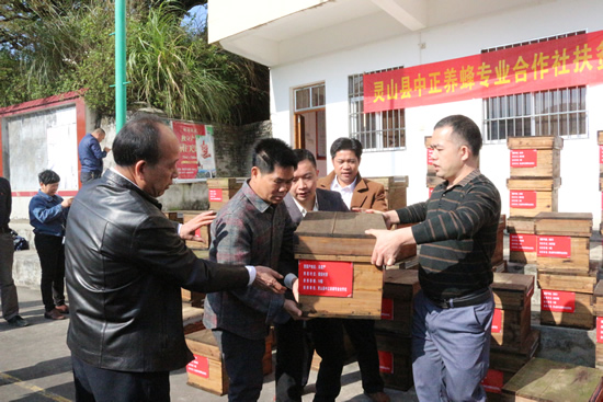 3月21日上午,灵山县中正养蜂专业合作社在石塘镇镇安村委会养蜂产业示范园举行扶贫养蜂发放仪式。