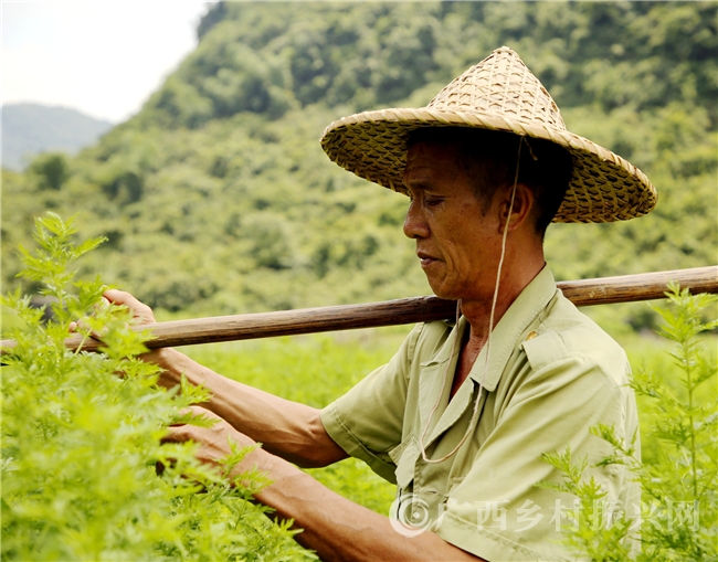 7月13日,在融安县泗顶镇吉照村青蒿种植示范基地,贫困户覃绍恩正在管护青蒿。