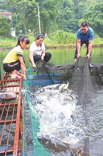 养殖生态鱼,缘于2015年底。有一天,蒙绍球在市场里听到一位顾客念叨:“我最喜欢吃清水河里的鱼,哪怕多花一点钱也愿意。”回到家后,他反复琢磨着顾客的话。“自家屋后那条源自大明山流淌出来的清澈河水,如果建池塘养鱼,加上四周充裕的草料,不正是生态养鱼的好地方嘛!”第二年春节还没过完,蒙绍球就说服左邻右舍近10户人家,合伙一起养鱼,并组成养鱼合作社。在流转各家上百亩池塘基础上,又垒出100多亩山塘。还让20个贫困户在合作社里入股养殖生态鱼。