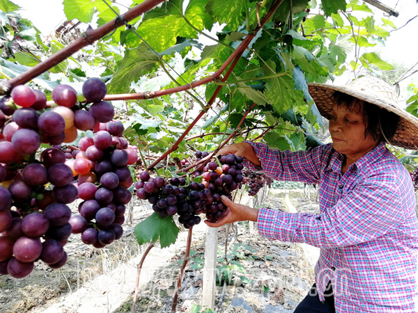 图为7月24日,在富裕村地坪小组朱锦发葡萄园内园主正在采摘巨峰葡萄进行出售。