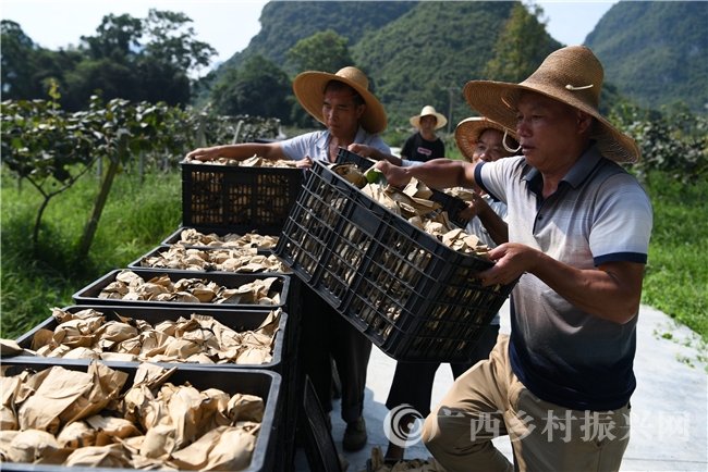 8月10日,在罗城仫佬族自治县“千亩千户”红心猕猴桃基地,当地群众正在采摘成熟的果实,装车外运销售。