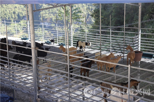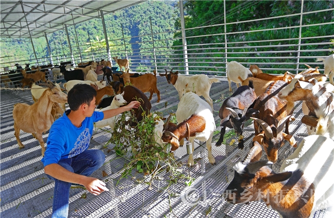 近日,在大化瑶族自治县北景镇安兰村弄纳山羊养殖基地里,合作社社员正在新建成的吊楼式钢架结构的羊舍里,用青饲料喂养羊群。