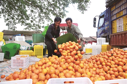 武鸣区因地制宜抓特色产业,全城区“3+1”特色产业覆盖城区贫困户3707户,覆盖率达94.3%。图为武鸣区双桥镇村民柑橘收购场景。