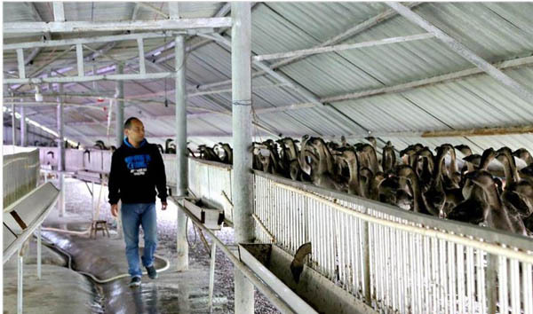 广西宜新鸿运农业科技有限公司总经理刘振宏在查看幼鹅的生长情况。