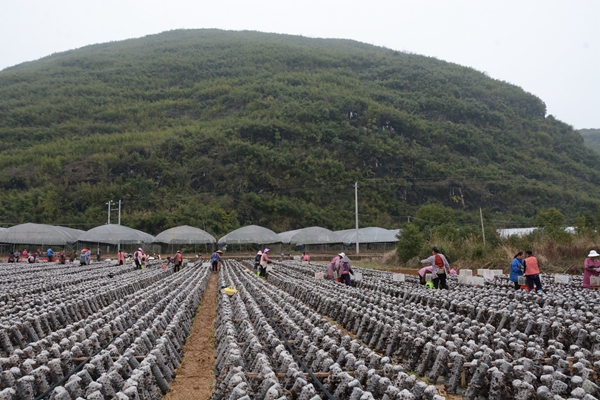 春耕时节收获忙,富川瑶族自治县新华乡神农谷黑木耳种植基地迎来了今年的首次丰收。