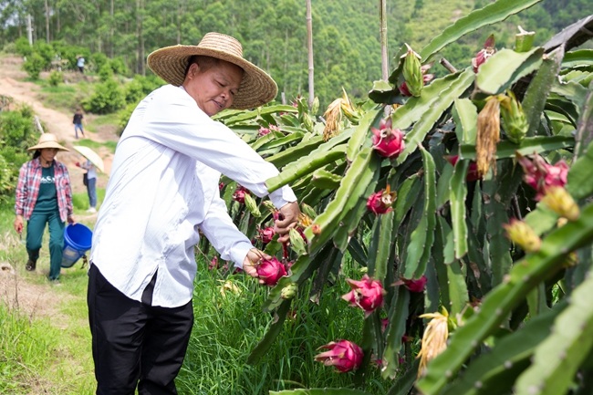7月18日,在贵台镇那逻村的钦北区绿桥种养专业合作社火龙果种植园内,村民正在采收火龙果。