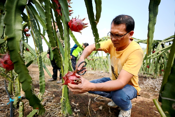 近年来,江州区濑湍镇板兰村大力发展火龙果种植,助力脱贫攻坚。在脱贫致富带头人黄运偲的带领下,基地发展成效明显,火龙果种植面积由原来的50亩扩种到100亩,2017年以来产量达12万公斤左右,产值70万元左右,为板兰村脱贫攻坚工作发挥积极作用。图为黄运偲正在采摘火龙果。岑华蓉 摄
