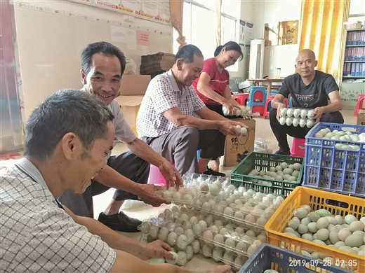 徐光明(右一)和龙岭村群众一起将新鲜鸭蛋打包。甘永恒/摄
