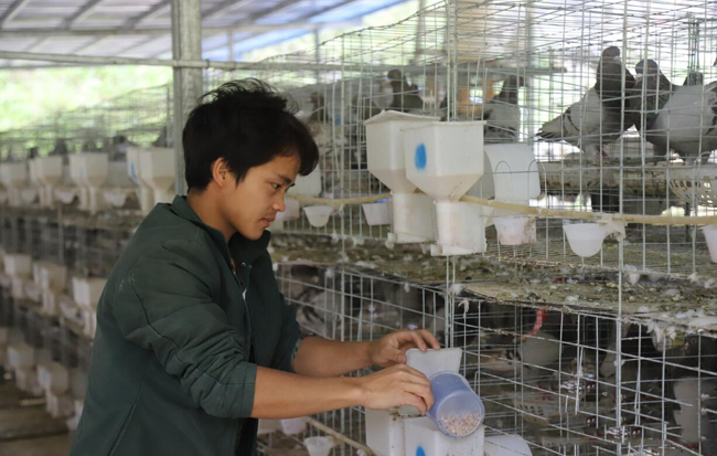 由于气候等自然条件因素,大化板升乡的鸽子产业发展特别好,饲养鸽子也成了大化县委县政府在板升乡主力推行的特色的产业之一,八好村作为板升贫困发生率最高的行政村,自然也发展鸽子特色产业。麻洞屯鸽子养殖场是目前八好村两大鸽子养殖场之一,也位于蒙芳真老家房子前面不到一百米处。蒙芳真是该养殖场的主要护理员,也是第一个参与者,带领了周边十几个贫困户共同脱贫致富。蒙芳真把养殖场里的雌雄鸽子分得清清楚楚,按公母搭配一对对关在鸽笼的小格子里,促进他们交配。每天忙碌打理鸽子喂养饲料和饮水,时刻关注鸽子的点滴变化,精心呵护刚刚孵化的乳鸽,保障成活率。