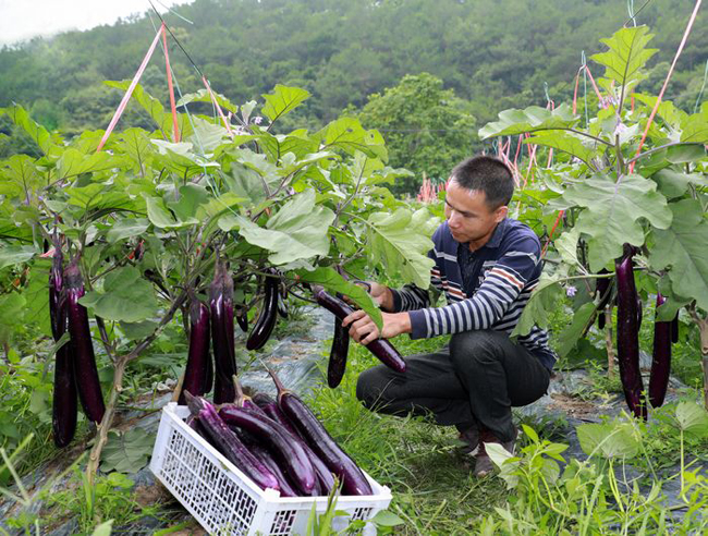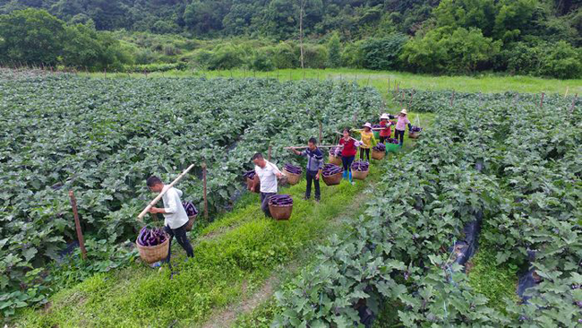 苍梧县旺甫镇祝洞村如丰种养殖农民专业合作的蔬菜种植基地,长势喜人,喜获丰收。村民们正娴熟地采摘、装箱茄子。这是今年收的第三茬,村民们热情高涨、干劲十足。