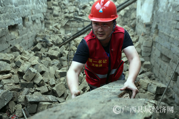 5月10日,在融安县桥板乡古丹村,驻村第一书记文敏捷在进行危房拆除工作。