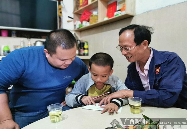 驻村第一书记冯永俊和吴承良一起检查辅导孩子作业。广西新闻网通讯员 王振钊 摄