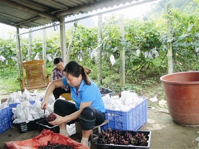 7月31日,罗城仫佬族自治县四把镇新印村“现代特色农业示范基地”农果园内,两名外地客商正在将巨峰葡萄套袋装箱,运往柳州、南宁等地销售。 近年来,该县引导农民发展特色效益农业,建成反季节蔬菜、水果基地3万亩,平均每亩年收入超万元。