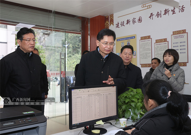 12月5日,自治区代主席蓝天立来到柳州市融水苗族自治县融水苗家小镇社区综合服务中心,向工作人员了解社区配套建设和管理服务情况。记者梁凯昌摄
