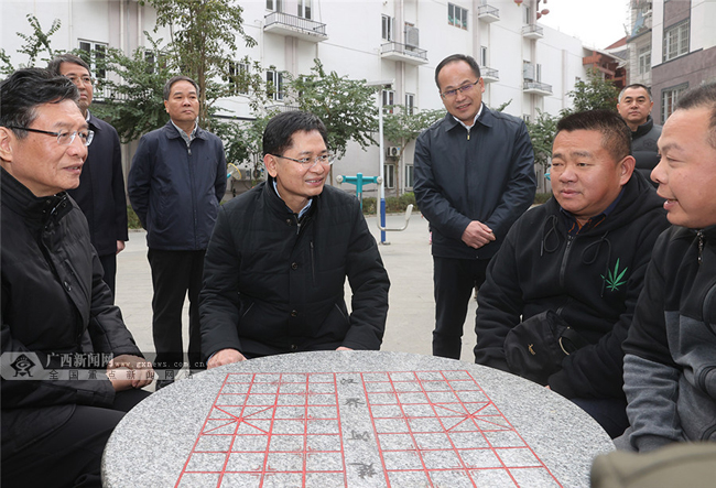 12月5日,自治区代主席蓝天立来到融水苗族自治县融水苗家小镇社区广场,走进群众中间,与大家亲切交谈,询问搬迁前后的生活变化。记者梁凯昌摄