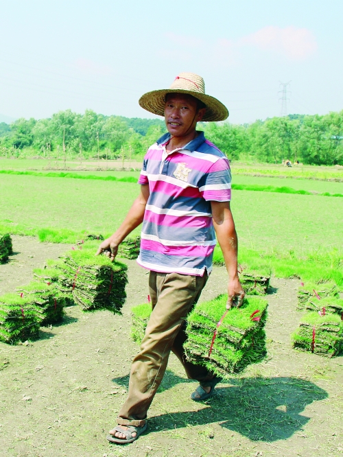 说起肖祥付和草皮的缘分,要回溯到2000年。2000年上半年,肖祥付在广州一处园林建设工地打工时,亲眼看到草皮价格5元一扎,就起了回乡种草的念头。“刚开始我只是一边注意了解市场信息,疏通销售渠道,一边学习种植技术,想着再回家试种,扩种。”肖祥付说,在外地了解到草皮的市场需求量很大,并确认灵川的土质适合草皮种植后,他立即引进马尼拉草种,在同化村委和甘棠村委流转土地50亩种植草皮,从此天天沉迷在草田里,按照学到的草皮种植规程,淋水施肥,撒药除虫,精心呵护这些草皮。三个月后,辛勤的耕耘终于有了回报,肖祥付的第一批草皮终于上市并卖出了好价钱,每亩纯收入达3000元以上。